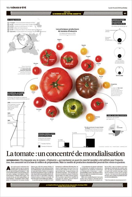 Pour assurer la bonne répartition des éléments sur une double page et le respect des proportions, la technique infaillible, c’est de réaliser la maquette avec les graphiques, puis de l’imprimer à l’échelle réelle. Je mesure ensuite tous les éléments pour trouver les aliments à la bonne taille ou dans les bons dosages. Je viens poser tous les aliments dessus. Une fois que c’est bon, je vire la feuille en dessous et je prends la photo ! Nous pourrions tricher en détourant les photos et en les redimensionnant dans Photoshop, mais pour moi, ça enlève tout l’intérêt et toute la poésie de cette production. Par exemple, pour la série d’été sur les tomates, il faut imaginer les infographistes des Echos, règle et mètre-ruban en main, en train de mesurer les tomates sur les étals du marché, cherchant des spécimens de 11, 6 ou 2 centimètres, sous le regard circonspect des commerçants !