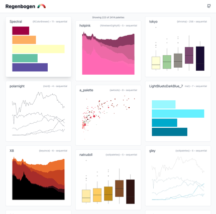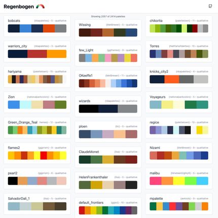 Pour les caméléons. Des palettes de couleurs accessibles spécialement pour la dataviz, c’est ce que propose Jan Simson sur Regenbogen. Nous apprécions la mise en situation de ces palettes dans une grande variété de graphiques, ainsi que les simulations pour les déficiences visuelles. Un simple clic pour copier le code et les utiliser dans vos projets R, Python ou autres.