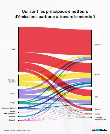 Bien préparer ses données. Si le dataset de l’Atlas mondial du carbone a l’avantage d’être très complet et exhaustif, il nécessite cependant quelques manipulations avant d’être utilisé pour notre graphique alluvial. Ainsi, nous allons nous intéresser à l’année la plus récente du jeu de données - 2024 - et pour éviter la multiplication de liens, nous allons nous concentrer uniquement sur les émissions par type et par continent. Quelques tableaux dynamiques et transpositions plus tard, nous voici avec un super jeu de données prêt à être glissé dans RAWGraphs (nous vous l’avons préparé dans l’onglet “DATA_ALLUVIAL”).