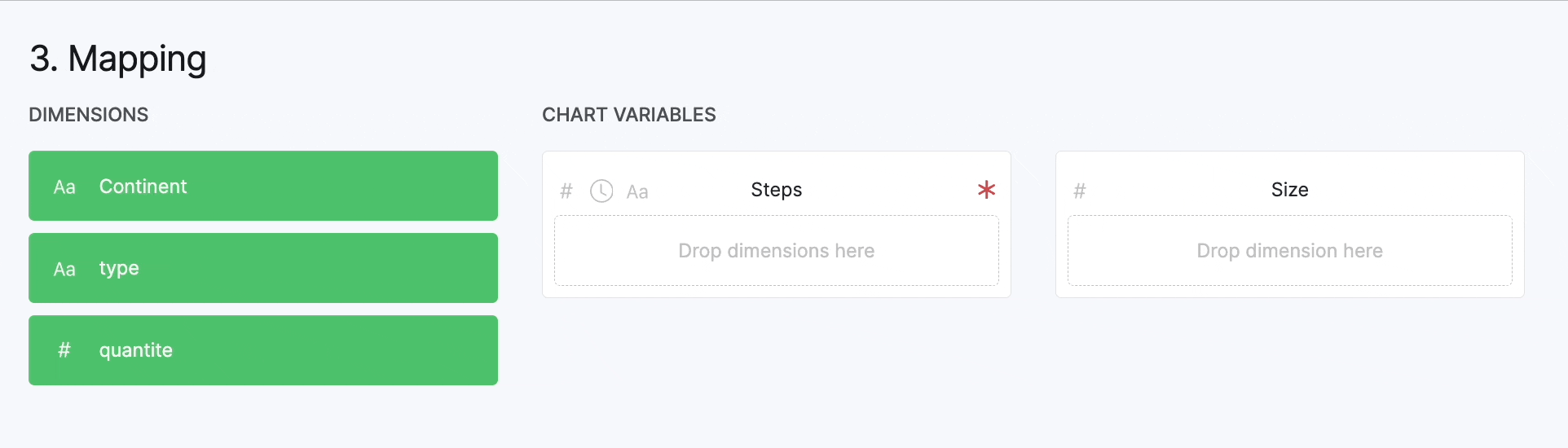 3/ Mapper vos dimensions : il s’agit de déterminer quelles données utiliser pour les étapes et les tailles de liens. Dans notre cas, les étapes sont les continents et les types d’émissions, et la taille sera la quantité de CO2 bien sûr. Il est important de préparer correctement vos données en amont si vous voulez qu’elles soient organisées selon ces dimensions par exemple.